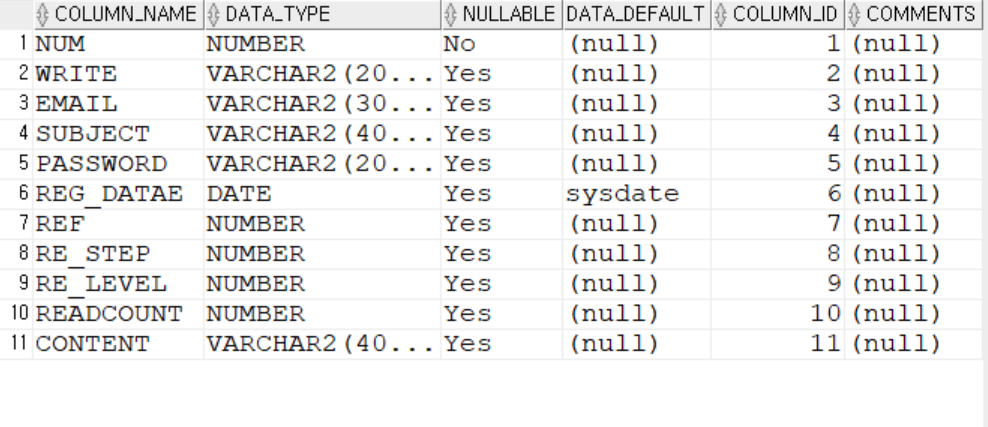 이런식으로 테이블을 생성했고, NUM컬럼은 1씩 증가하는 시퀀스를 주었다.